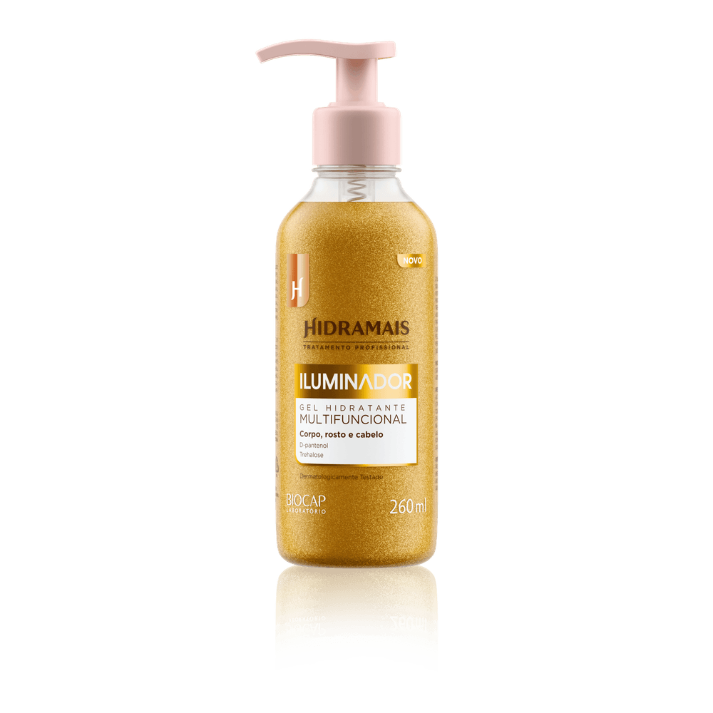 Iluminador multifuncional com partículas douradas. Hidrata, dá brilho e promove glow sem transferir ou deixar a pele oleosa.